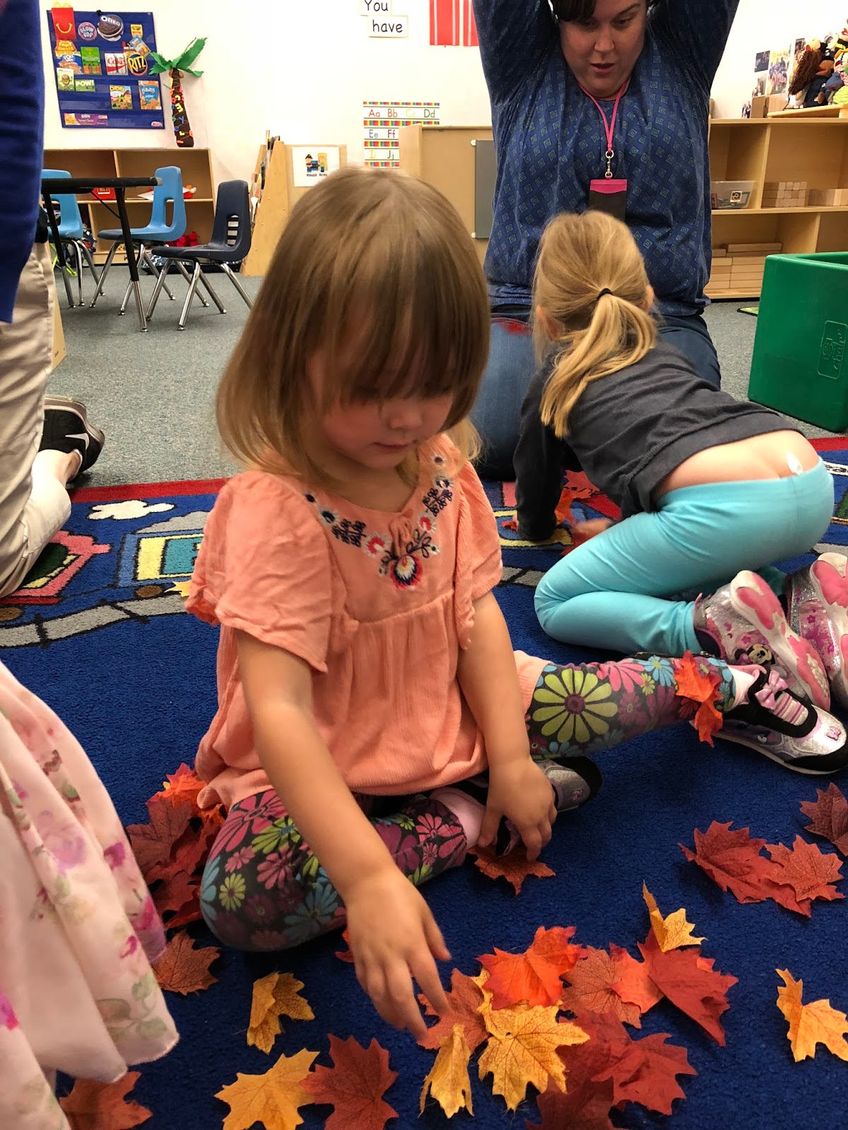 So Miss Carrie brought a box of leaves to the class. She introduced them to one of her most favorite fall activities - playing in the leaves. We threw them, compared colors and sizes, piled them on people, and scooped them up again.